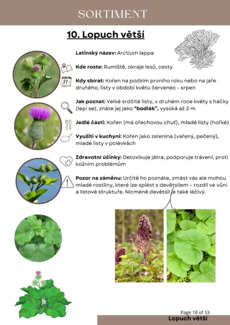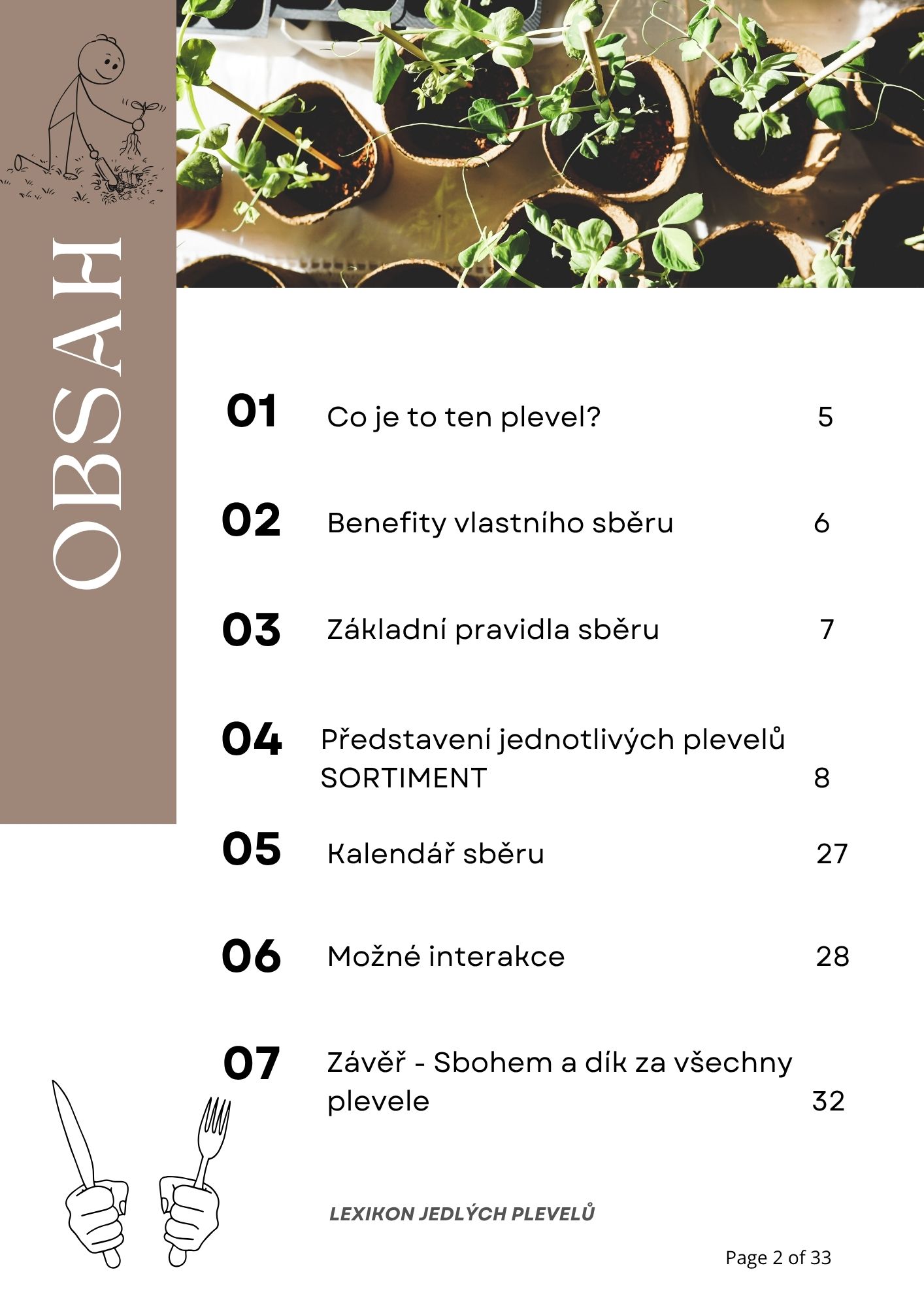 - Ebook obsahuje celkem 32 stránek a bonusJe rozdělen na informace o výhodách a základních pravidel vlastního sběru , následuje představení jednotlivých plevelných druhů a v neposlední řadě i informace o možných interakcích s léky nebo nežádoucí účinky. Součástí je i kalendář sběru v přehledné tabulce.